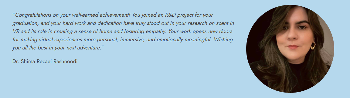With a passion for communication, language, and immersive technology, Laura Iannone’s Master's research at Breda University of Applied Sciences earned her first prize in the 2024/2025 edcom Graduation Competition. Her thesis, ‘Odor in VR. A qualitative study on the value of olfactory stimuli to enhance presence and empathy in the VR project Being There’, explored the integration of olfactory stimuli into a virtual museum created to support migrant women.